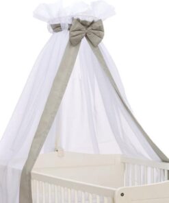 Prachtige, sfeervolle sluier om de wieg of het ledikantje helemaal compleet te maken. De sluier is gemaakt van 100% polyester. Afgewerk met een katoenen bies en sierlijke strik. De sluier heeft onder een diameter van 240 cm. De hoogte van de sluier is 160 cm hoog.